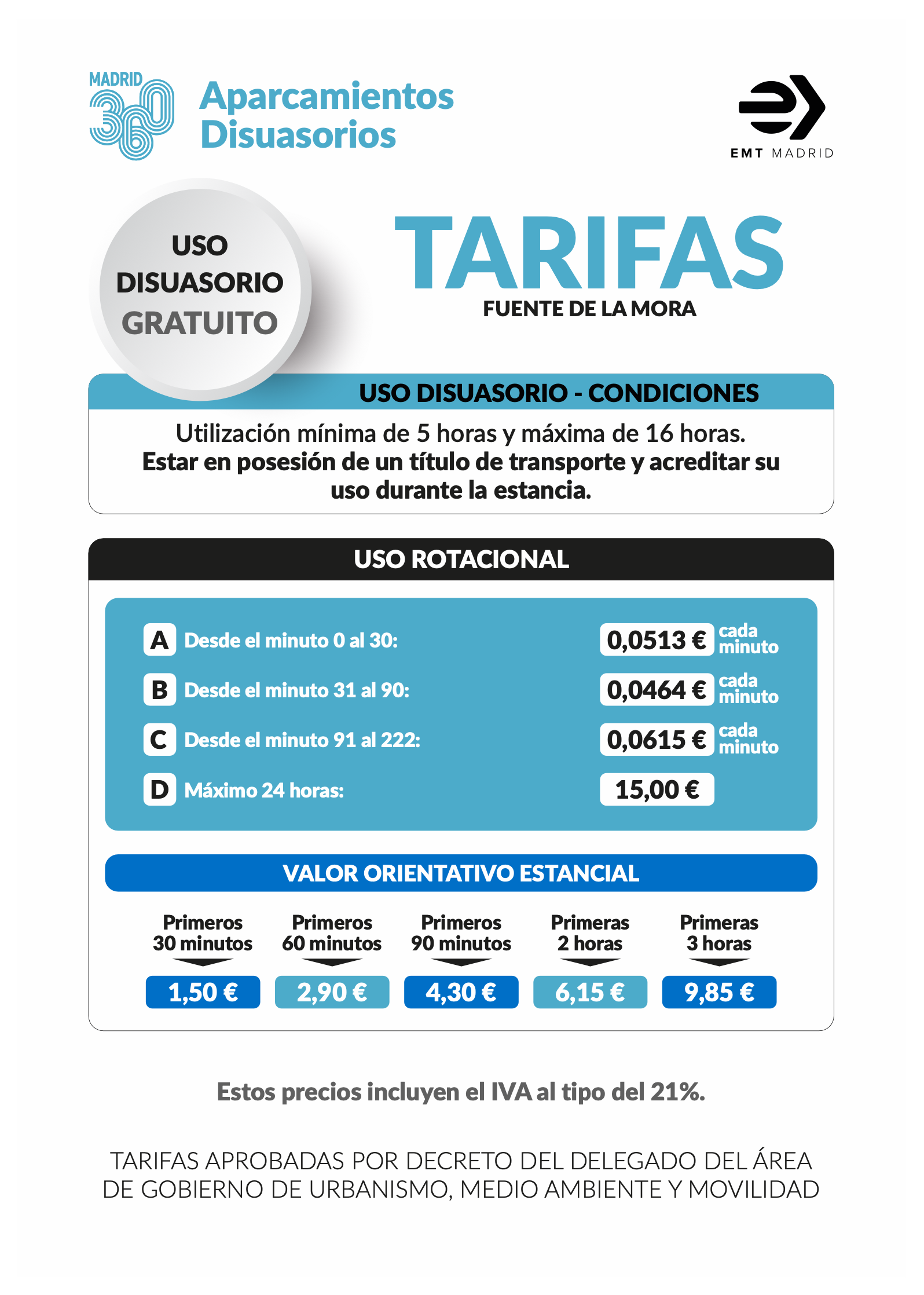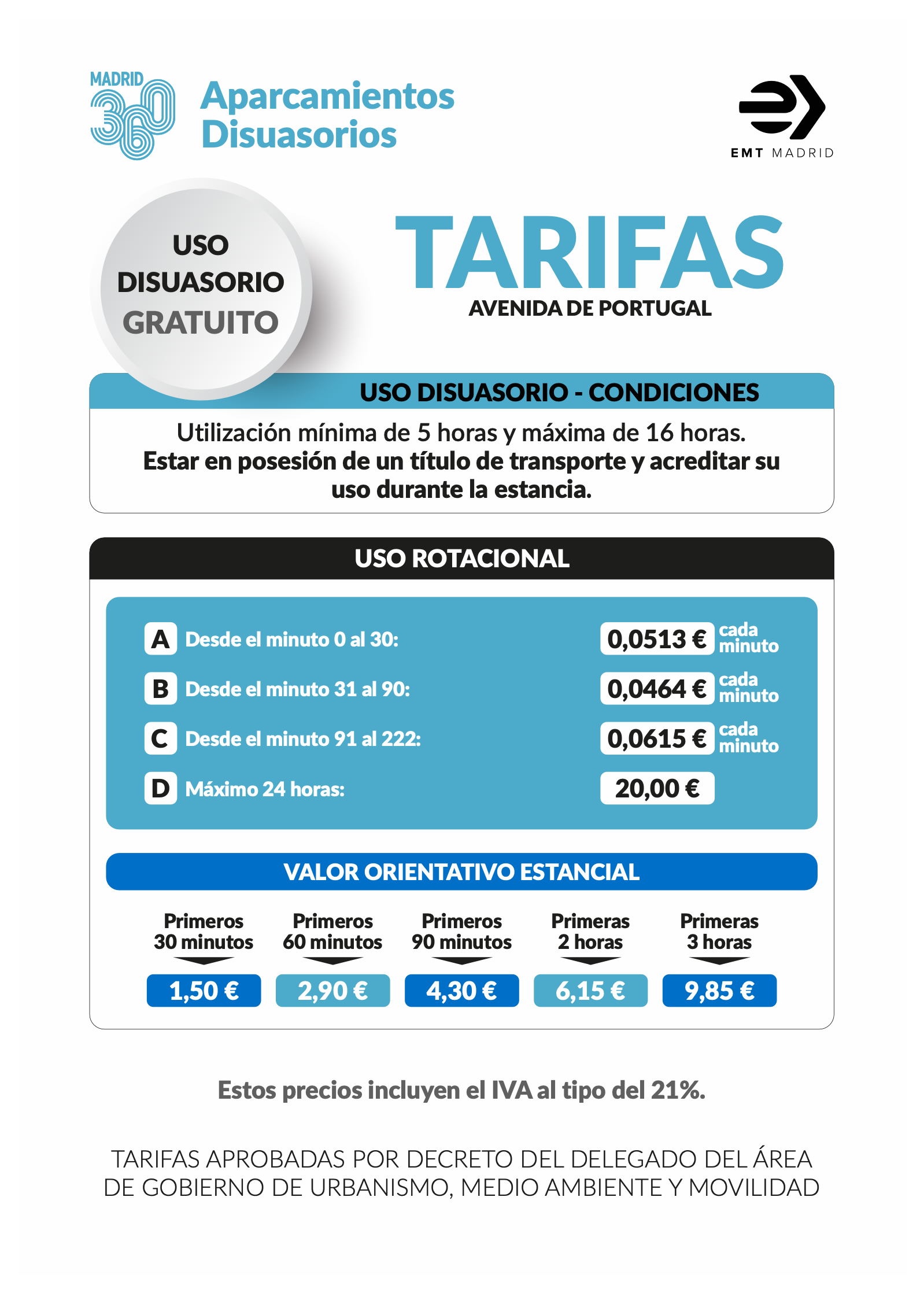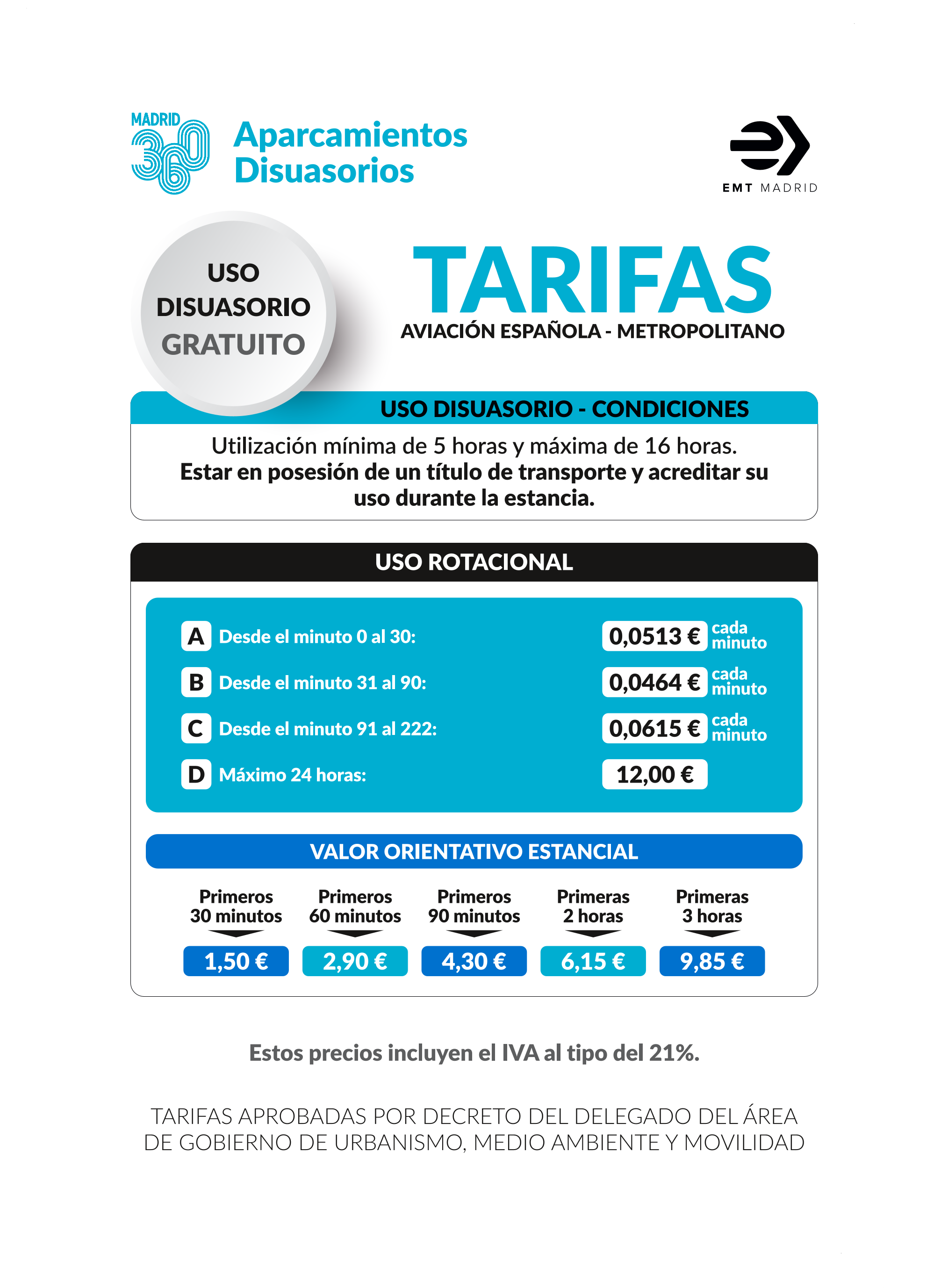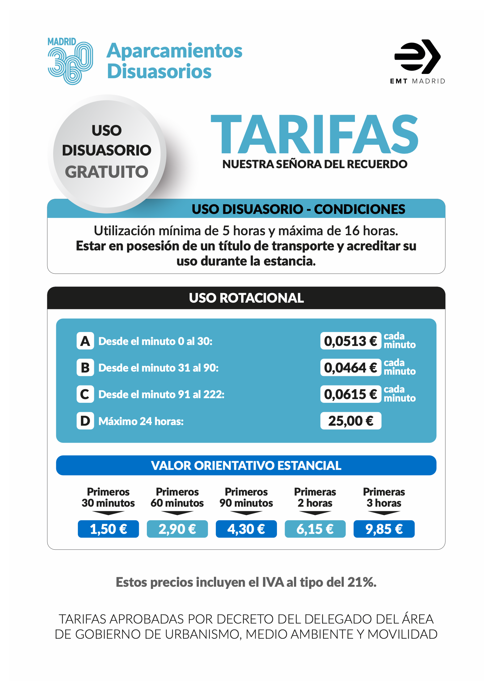 ** NOTA: Estacionamiento disuasorio gratis con uso de cualquier título de transporte público colectivo, por un período de tiempo no inferior a 5 horas ni superior a las 16 horas.